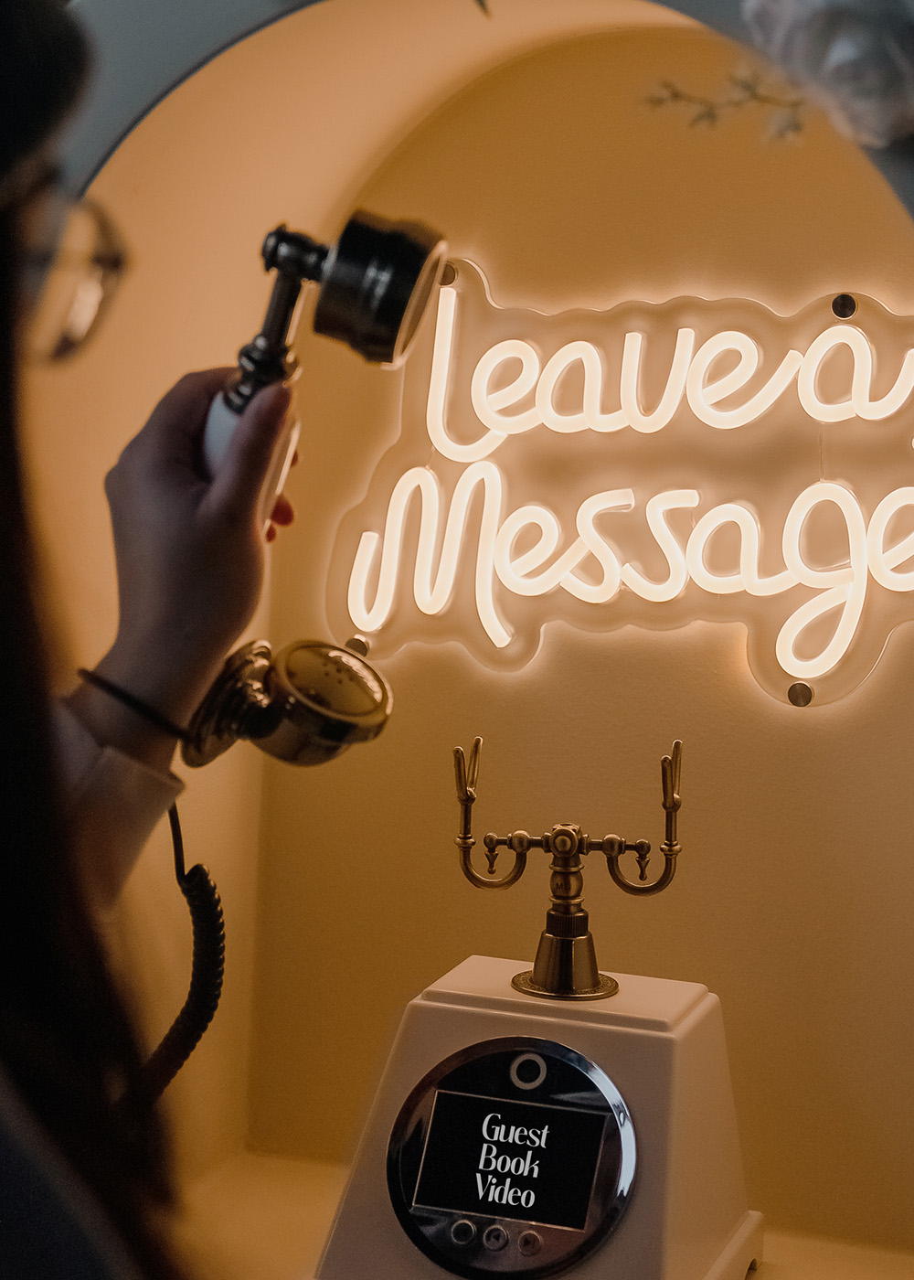 While other video booths can feel intimidating, ours works just like a phone call. Guests pick up the phone, hear your custom welcome message, and the words start to flow.